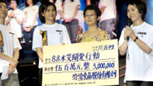 2008年8月17日,鳳凰衛(wèi)視為臺(tái)灣88水災(zāi)舉辦《88水災(zāi)關(guān)愛(ài)行動(dòng)》大型慈善賑災(zāi)晚會(huì),洽洽食品在晚會(huì)現(xiàn)場(chǎng)捐款500萬(wàn)新臺(tái)幣支援臺(tái)灣災(zāi)區(qū)同胞。