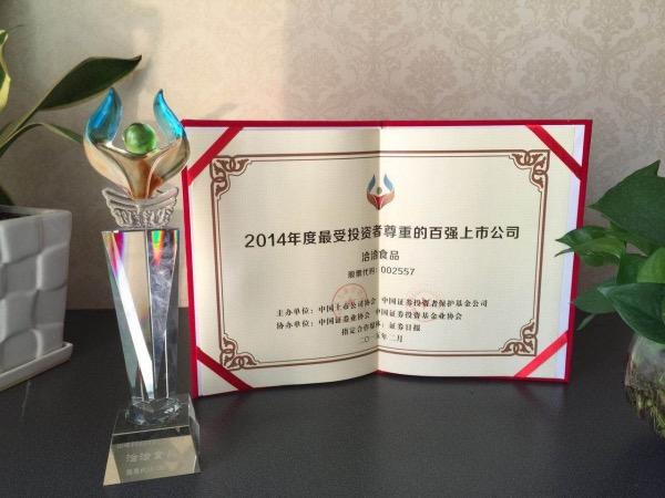 2015年2月12日,由中國證監(jiān)會上市公司監(jiān)管部、中國上市公司協(xié)會、中國證券投資者保護(hù)基金有限公司聯(lián)合主辦的“2015年上市公司投資者保護(hù)論壇”在北京舉行。論壇同期舉辦了隆重的頒獎(jiǎng)典禮,洽洽食品(002557),被評為“最受投資者尊重上市公司”榮譽(yù)稱號,安徽省僅海螺水泥、江淮汽車、洽洽食品三家上市公司獲此殊榮。