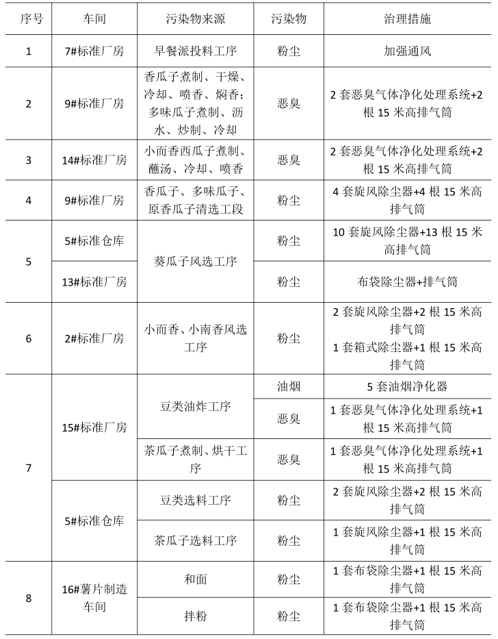 本項目廢氣主要為投料、攪拌、清洗和風(fēng)選等工段中產(chǎn)生的粉塵,油炸過程中產(chǎn)生的油煙廢氣、惡臭氣體,以及瓜子煮制、噴香和冷卻工段產(chǎn)生的惡臭氣體。具體治理設(shè)施見表3-1。