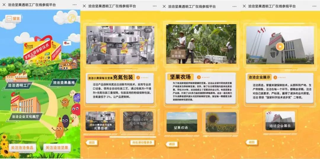 洽洽此次上線的洽洽堅(jiān)果透明工廠在線參觀平臺(tái),共為大眾設(shè)置了三個(gè)可參觀板塊:洽洽透明工廠、洽洽堅(jiān)果基地、洽洽企業(yè)文化展廳,以實(shí)景鏡頭+文字介紹方式對(duì)洽洽堅(jiān)果的源產(chǎn)地、生產(chǎn)、包裝、分揀裝箱等環(huán)節(jié)進(jìn)行了全方位展示。