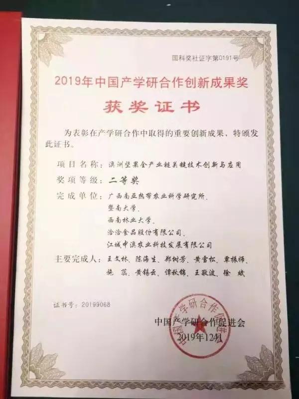 12月31日,第十三屆中國產(chǎn)學研合作創(chuàng)新大會在北京隆重召開,洽洽受邀參加此次大會及頒獎典禮。會上,由洽洽、南亞所、暨南大學、西南林業(yè)大學和江城中澳農(nóng)業(yè)科技發(fā)展有限公司共同申報的“澳洲堅果全產(chǎn)業(yè)鏈關鍵技術研究與應用”榮獲2019年中國產(chǎn)學研合作創(chuàng)新成果獎二等獎。