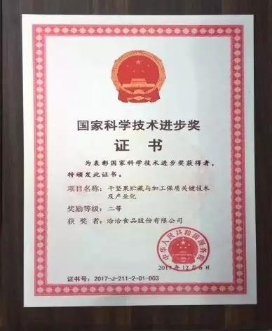 洽洽本次榮獲的“中國產(chǎn)學研合作創(chuàng)新成果獎”,是繼國家科學技術進步獎后,洽洽又一次獲得的國家級榮譽。接連國家級獎項的肯定,充分展現(xiàn)了洽洽在堅果基礎研究及研發(fā)領域的雄厚實力。