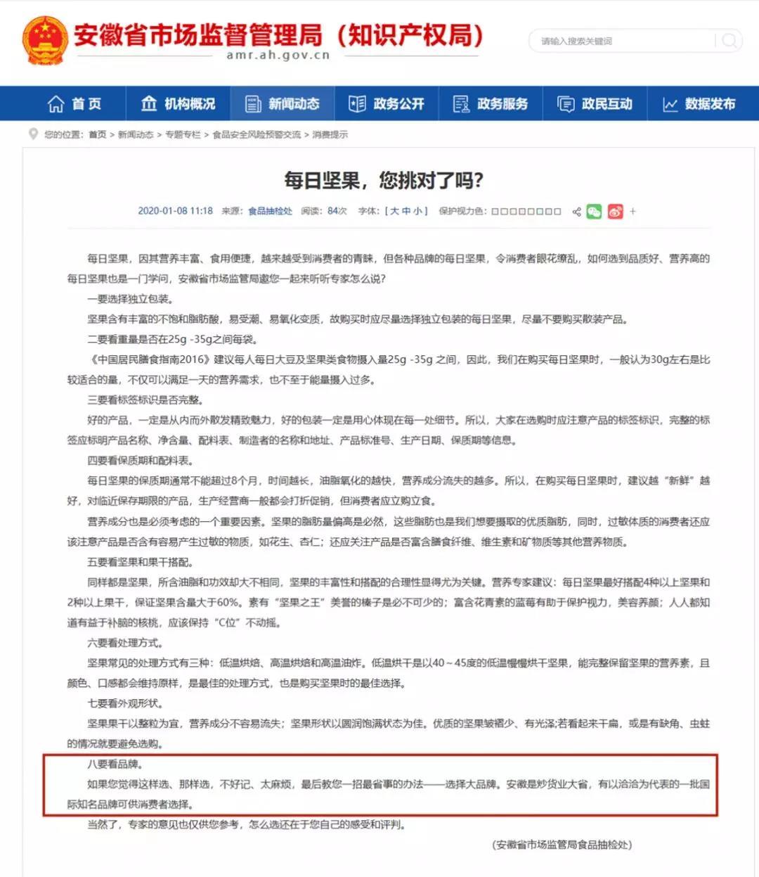 十分榮幸,洽洽在文中被安徽省市場監(jiān)管局提及,作為國際知名品牌,又是首家入選國家健康計劃的堅果品牌,在堅果行業(yè)始終處于領(lǐng)先地位。