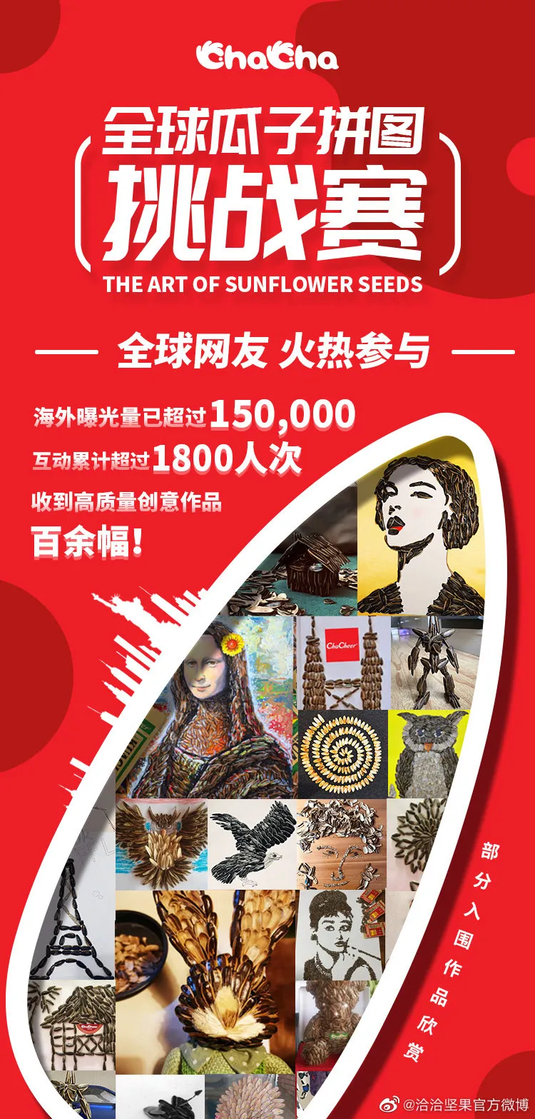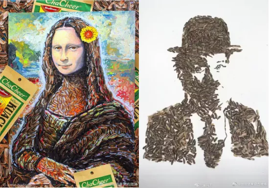 而且在這段特殊的日子里,嗑瓜子已成了一項(xiàng)不分男女老少的“全民運(yùn)動(dòng)”。就在我們宅家天天喊無(wú)聊的時(shí)候,國(guó)內(nèi)外涌現(xiàn)出一大批玩瓜子的藝術(shù)家。看完他們?cè)?/span>洽洽全球瓜子拼圖大賽中提交的作品之后,你就會(huì)發(fā)現(xiàn),原來嗑瓜子這么日常的事兒,有人也能秀出天際。