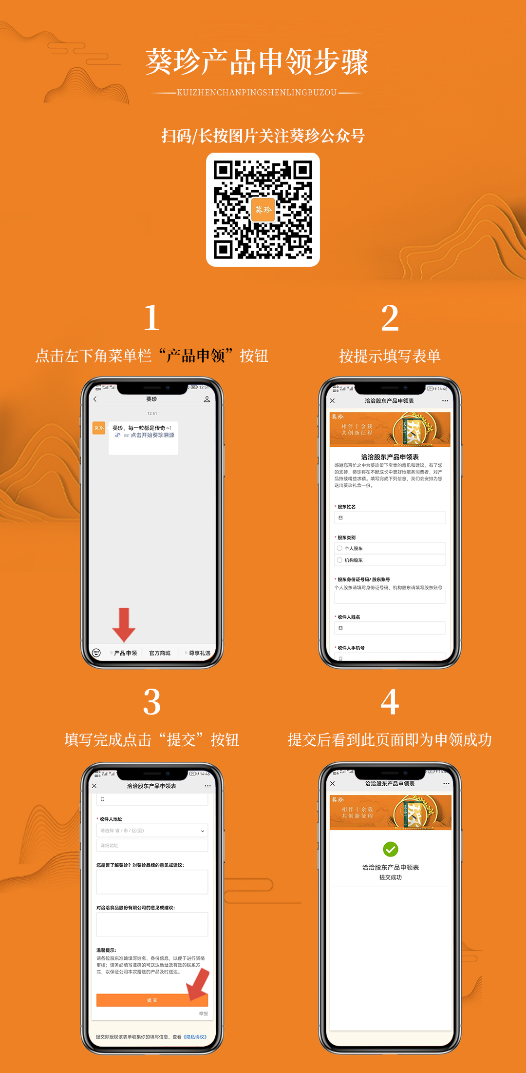 公司股東可于2022年5月21日起,通過關注公司“葵珍”微信公眾號,點擊“產品申領”進入申領頁面,填寫并提交產品申領單。