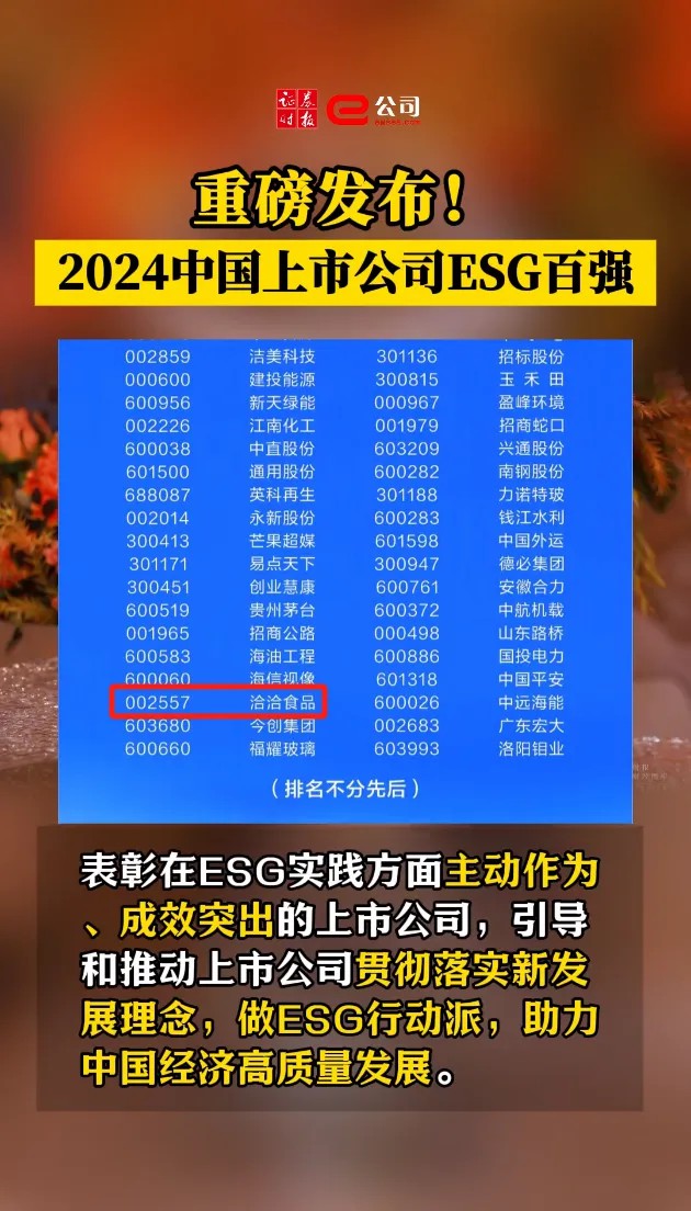 10月24日上午,“2024中國上市公司ESG百強”榜單正式揭曉!洽洽食品榮耀上榜!據(jù)悉,榜單由人民日報社旗下的主流財經(jīng)媒體平臺證券時報評出,旨在表彰在ESG實踐方面主動作為,成效突出的上市公司,鼓勵引導(dǎo)和推動上市公司貫徹落實新發(fā)展理念,做ESG行動派,助力中國經(jīng)濟(jì)高質(zhì)量發(fā)展。