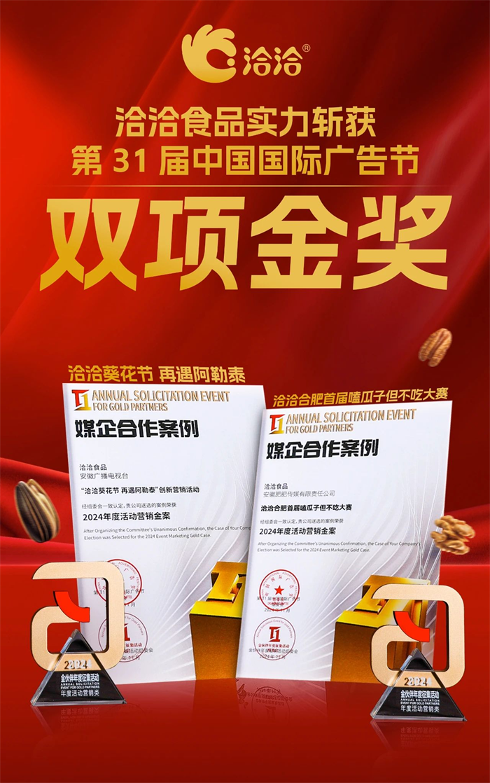 11月28日,第31屆中國國際廣告節(jié)在鷺島廈門璀璨啟幕,洽洽以其卓越的營銷創(chuàng)意斬獲“2024年度活動(dòng)營銷金案”雙項(xiàng)金獎(jiǎng),分別是“洽洽合肥首屆嗑瓜子但不吃大賽”和“洽洽葵花節(jié),再遇阿勒泰”。