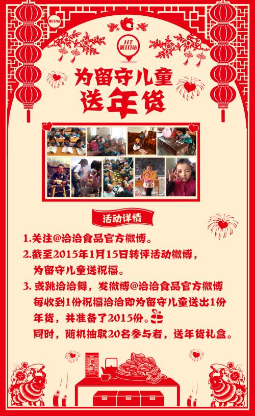 2014年,洽洽食品推出了年度輕公益系列活動“Happy Ten”,又名“十個夢想”。“為留守兒童送年貨”是“Happy Ten”的第十站。正值新年,洽洽食品將最后一站聚焦在留守兒童群體上,希望通過新年送祝福、送年貨的公益形式,讓更多的人關(guān)注留守兒童,也讓孩子們切實感受到溫暖和快樂的味道。
