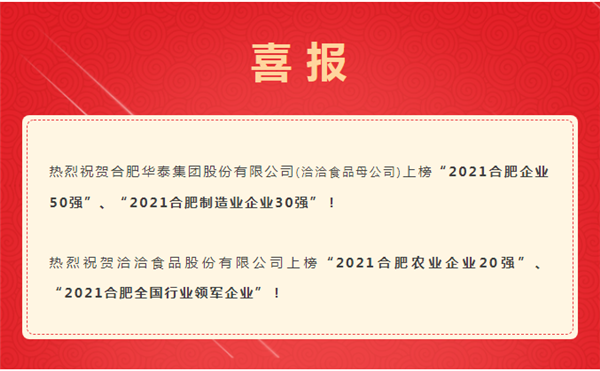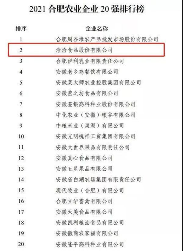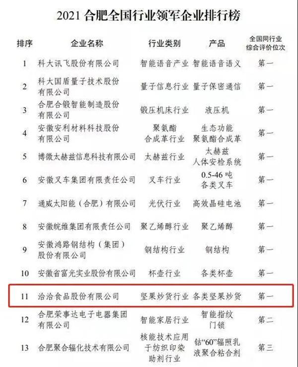 洽洽食品股份有限公司上榜“2021合肥農(nóng)業(yè)企業(yè)20強(qiáng)”、“2021合肥全國行業(yè)領(lǐng)軍企業(yè)”!其中,洽洽更是在2021合肥全國行業(yè)領(lǐng)軍企業(yè)排行榜中的堅果炒貨行業(yè)排行第一!