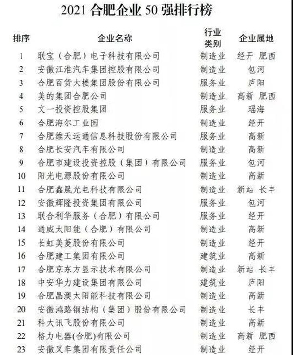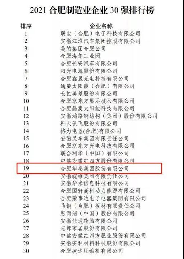10月19日上午,2021合肥企業(yè)50強(qiáng)發(fā)布會在合肥市政務(wù)中心舉行。會上發(fā)布了2021合肥企業(yè)50強(qiáng)榜單。合肥華泰集團(tuán)股份有限公司上榜“2021合肥企業(yè)50強(qiáng)”、“2021合肥制造業(yè)企業(yè)30強(qiáng)”!